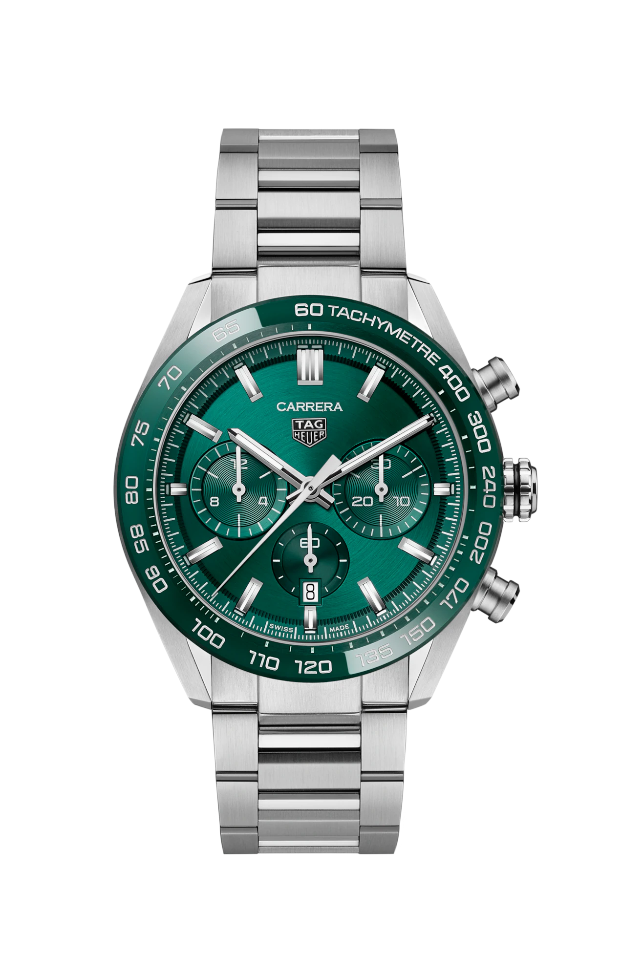 This classic TAG Heuer Carrera takes on a trendy allure with its bold green dial and matching ceramic bezel. The sporty design and monochromatic colour scheme add to the appeal of this adventure-ready timepiece, integrating the in-house Calibre TH20-00 movement.