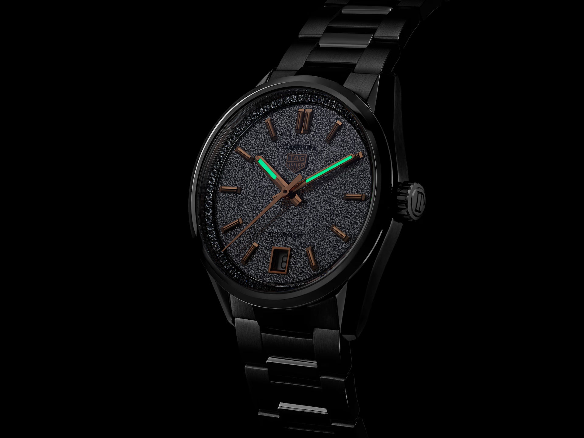 Elegance infuses every element of this luxurious TAG Heuer Carrera, crafted with utmost attention to detail. The subtle alliance of 76 diamonds (0.288 CT), rose gold plated indexes and hands, and silver adds a glamorous edge to this urban watch. An unmissable classic.