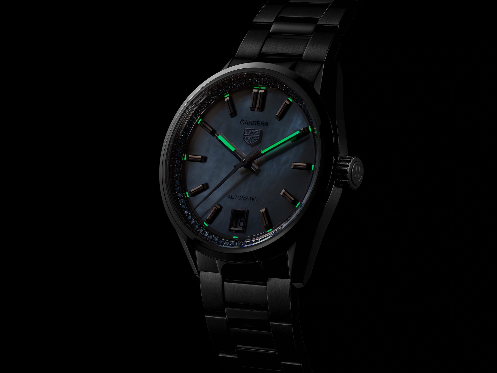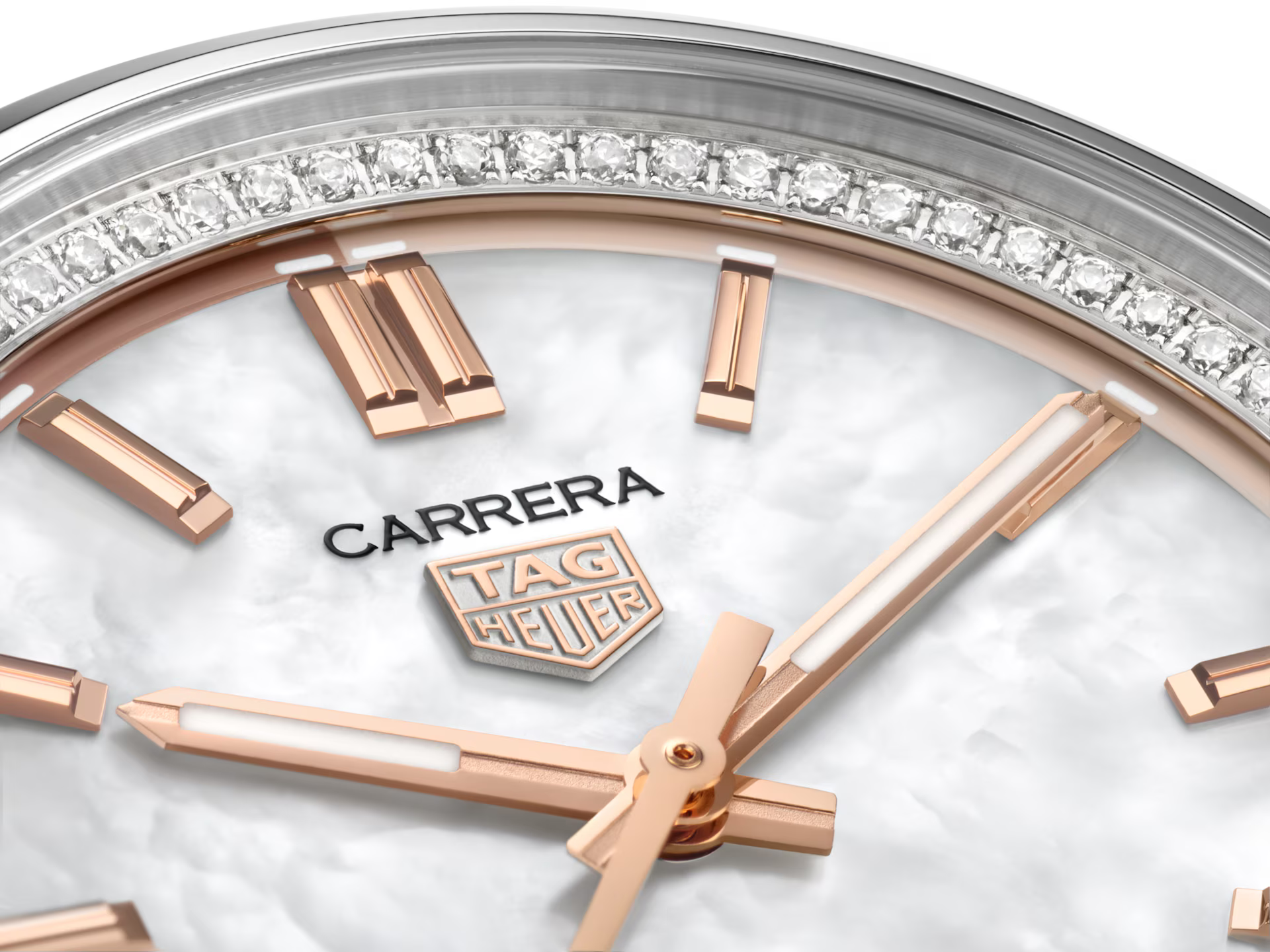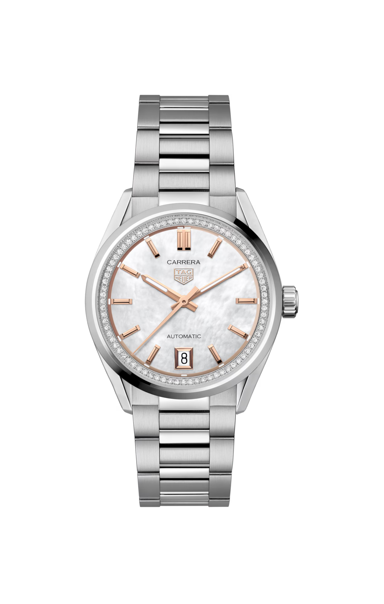Step into a world of timeless elegance with the TAG Heuer Carrera Date. Crafted in a 36 mm case, this exquisite timepiece combines a white mother-of-pearl dial set with 76 diamonds (0.288 cts) on the flange, offering a luxurious touch to the iconic Carrera collection.