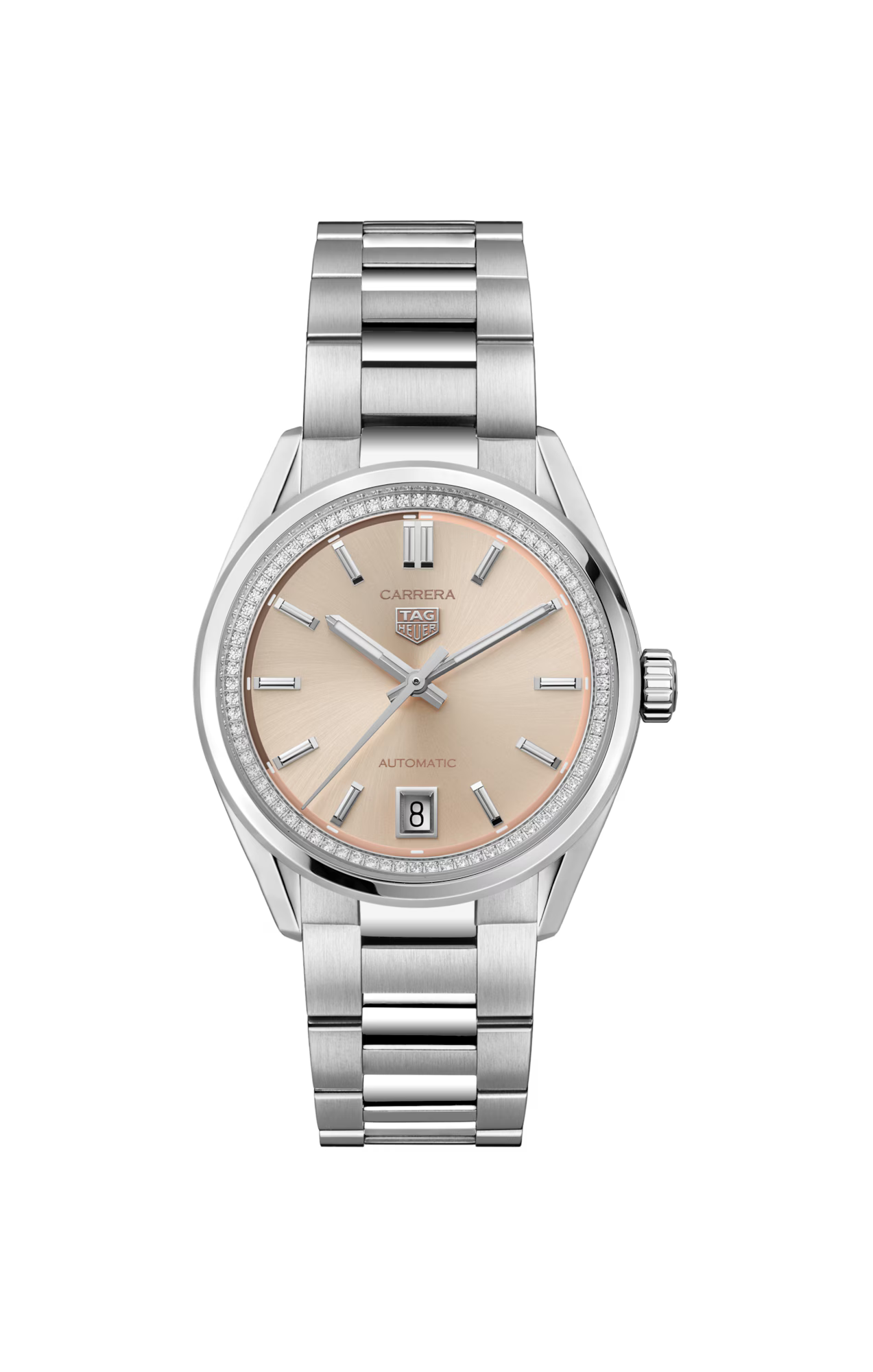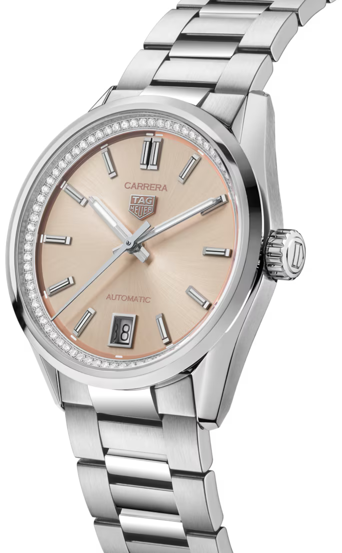 With its subtle powdery pink-coloured dial circled by a stunning flange set with shimmering diamonds (0.288ct.), this 36 mm TAG Heuer Carrera distils its unique vision of classic urban elegance. A signature piece crafted for an ambitious and driven lifestyle.