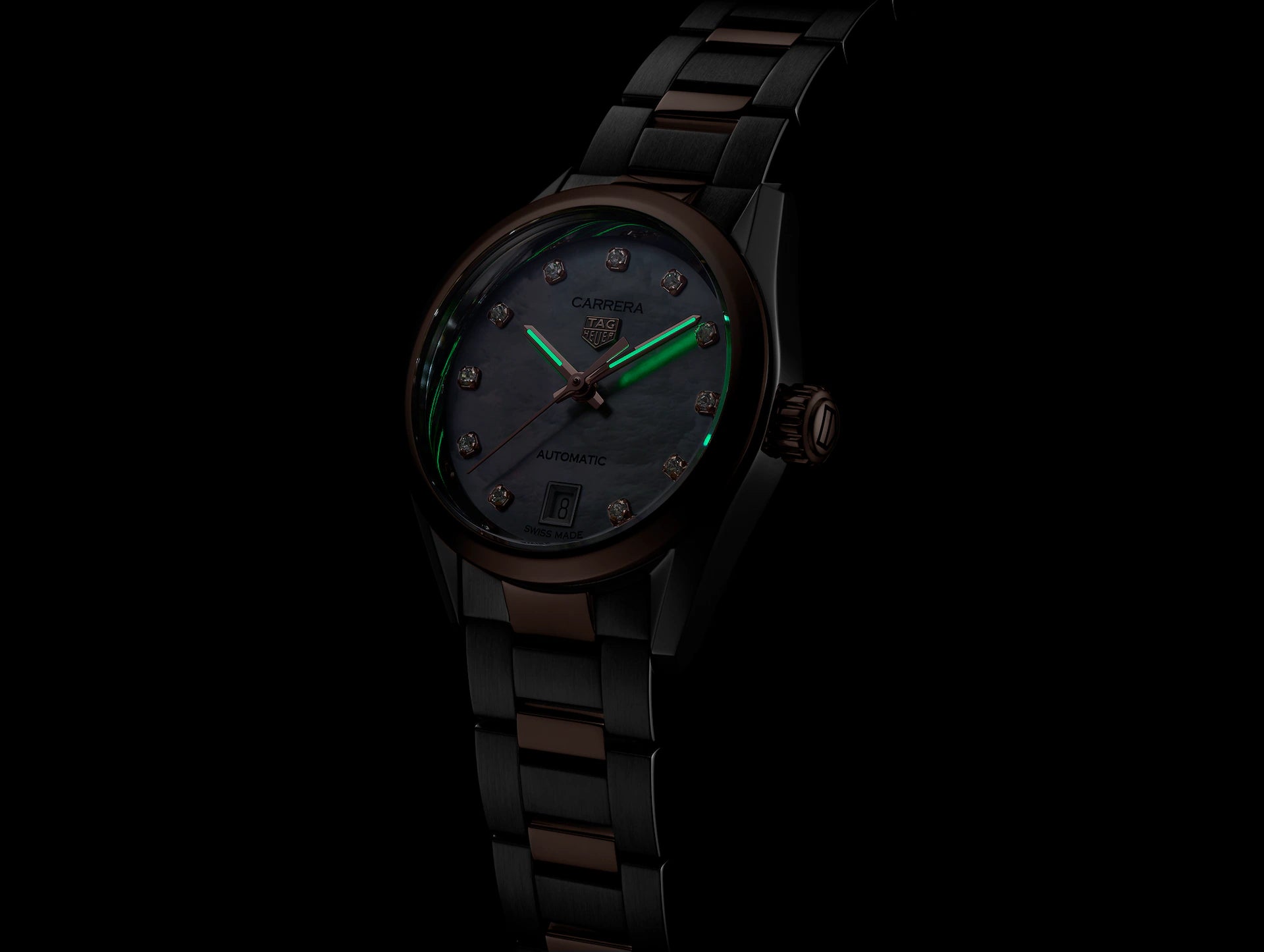 Twelve radiant diamond indexes take place on a mother-of-pearl dial in this stunning Carrera watch. Embodying the function and style of TAG Heuer, it's powered by a reliable quartz movement and arrives mounted on a sleek two tone H-link bracelet.