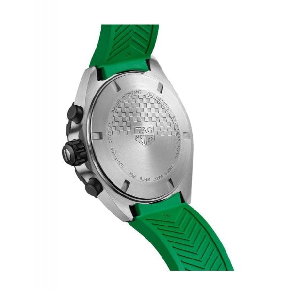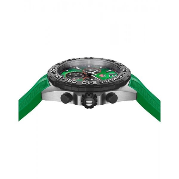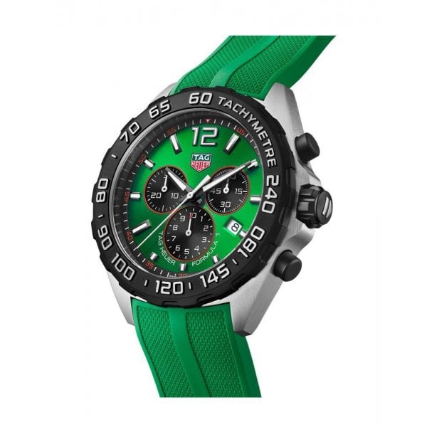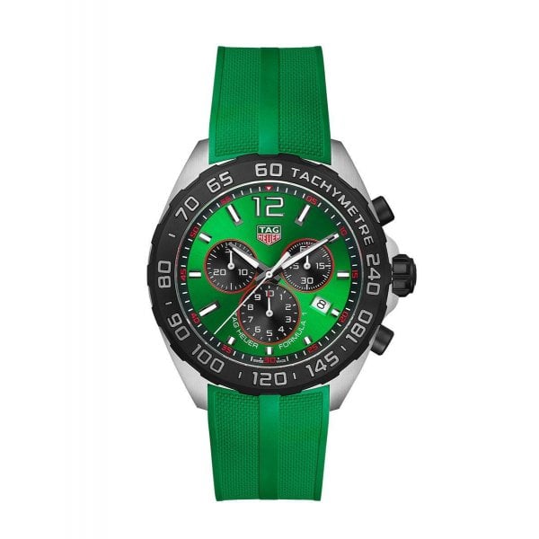 Setting the pace with colour and cool is the TAG Heuer Formula 1. A versatile 43mm chronograph with vivid green dial and matching rubber strap, full of sportive design codes, the motor racing collection is roaring ahead to victory.