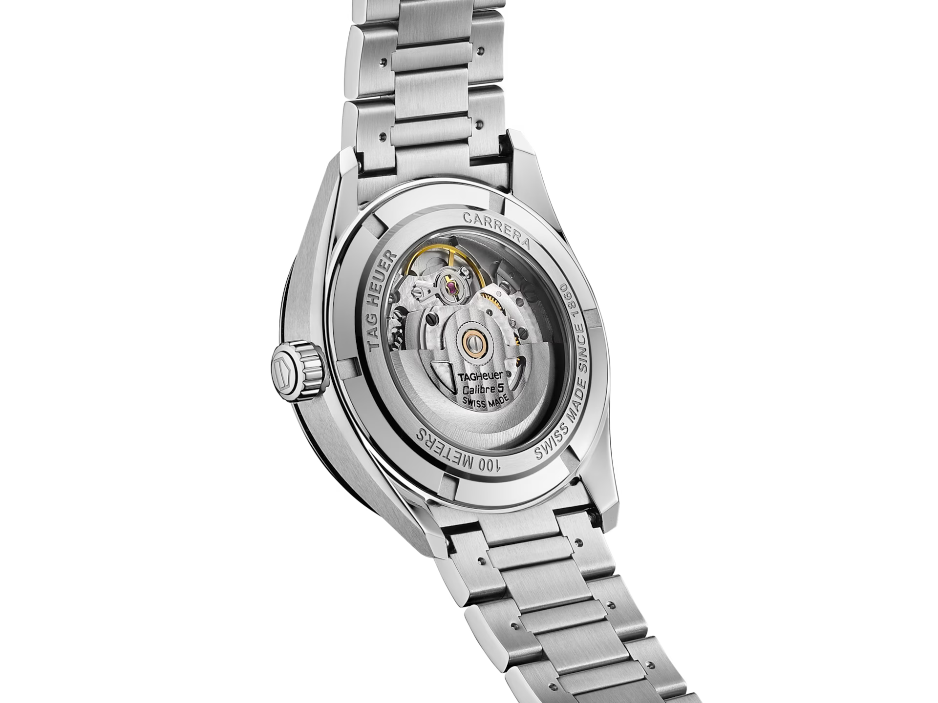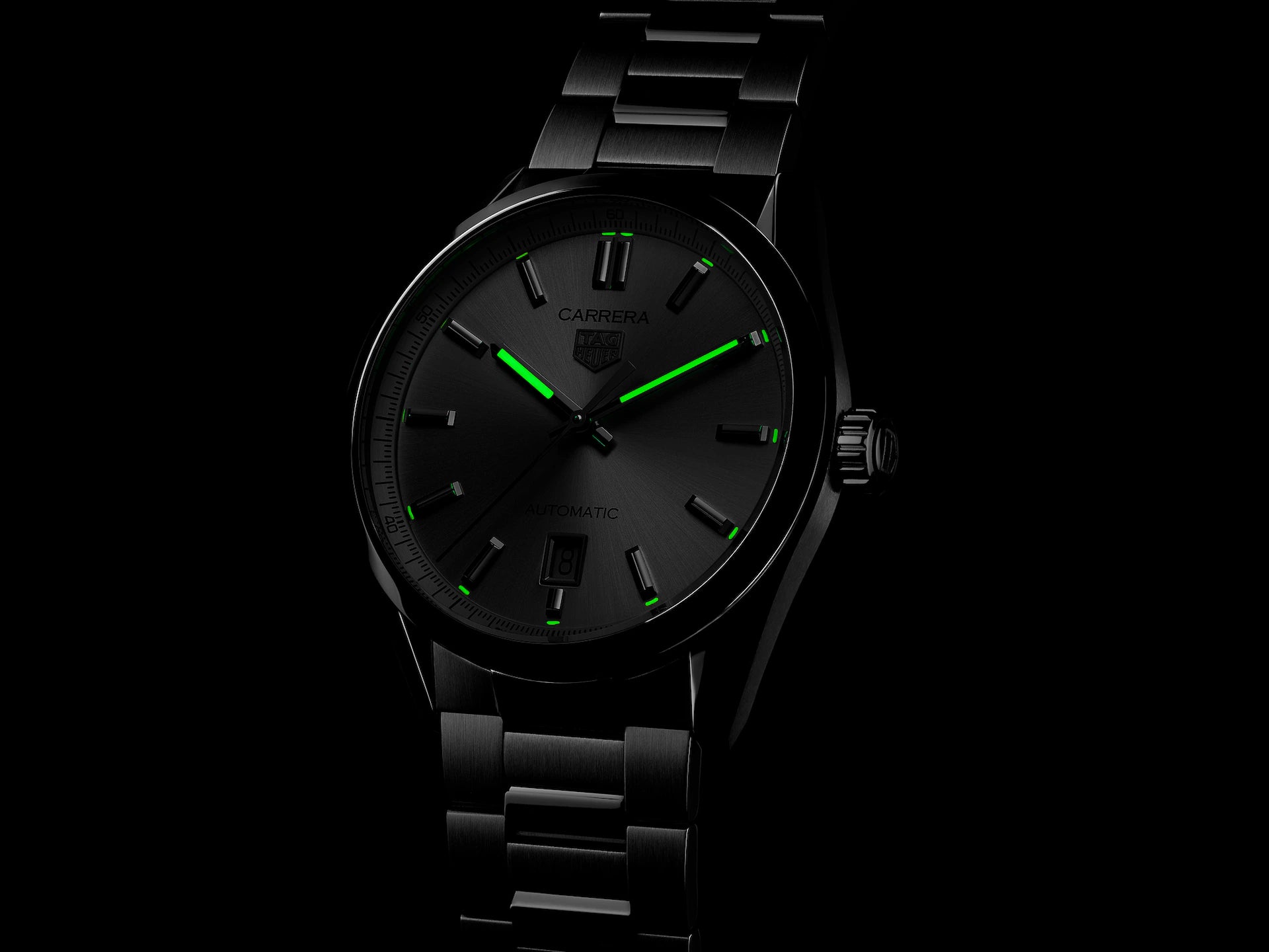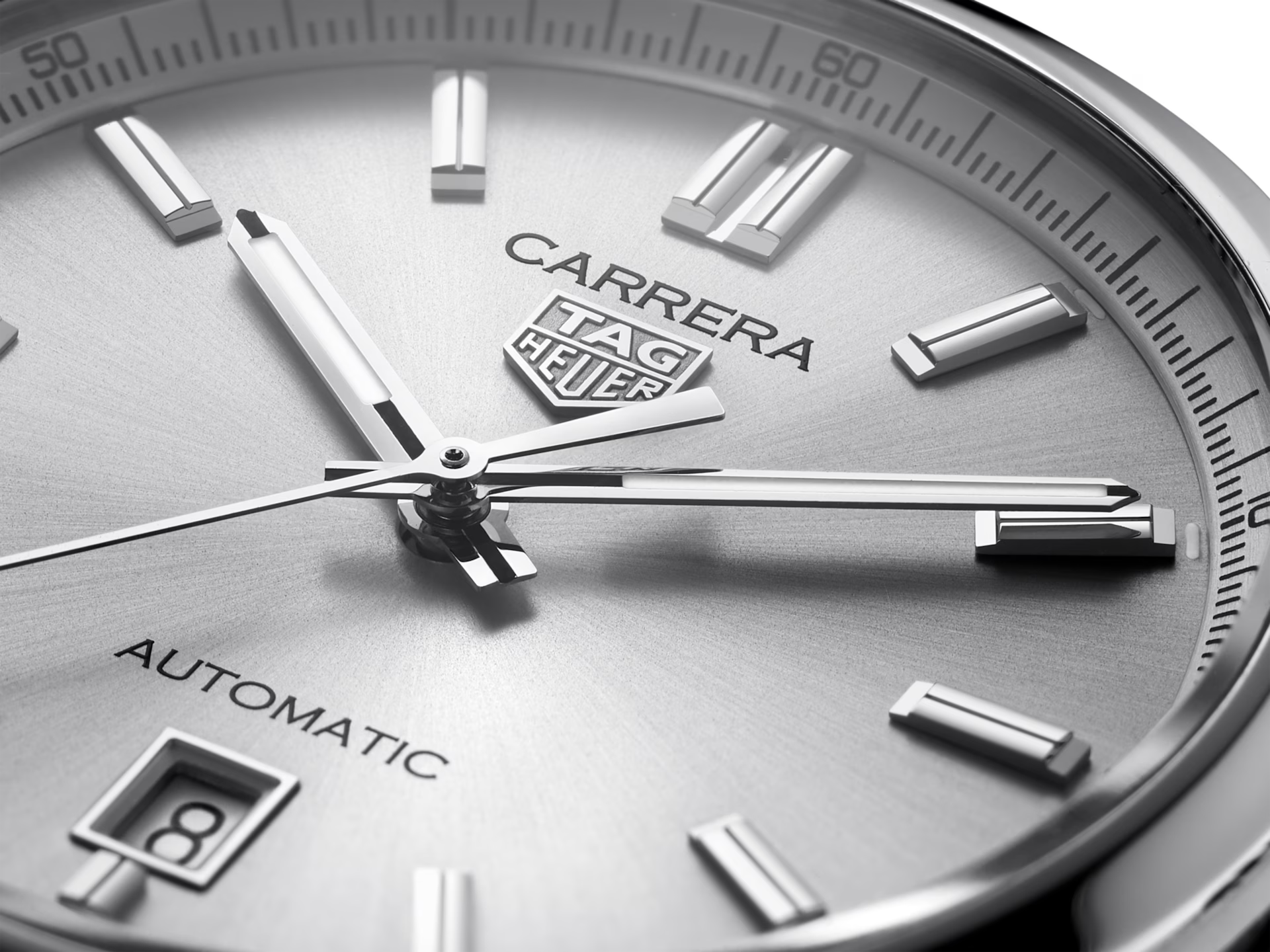 This TAG Heuer Carrera is ready for anything. Its brushed silver sunray dial is a statement of luxury, beautifully highlighted by the functional and elegant rhodium-plated TAG Heuer logo and Super-Luminova hands and indexes.