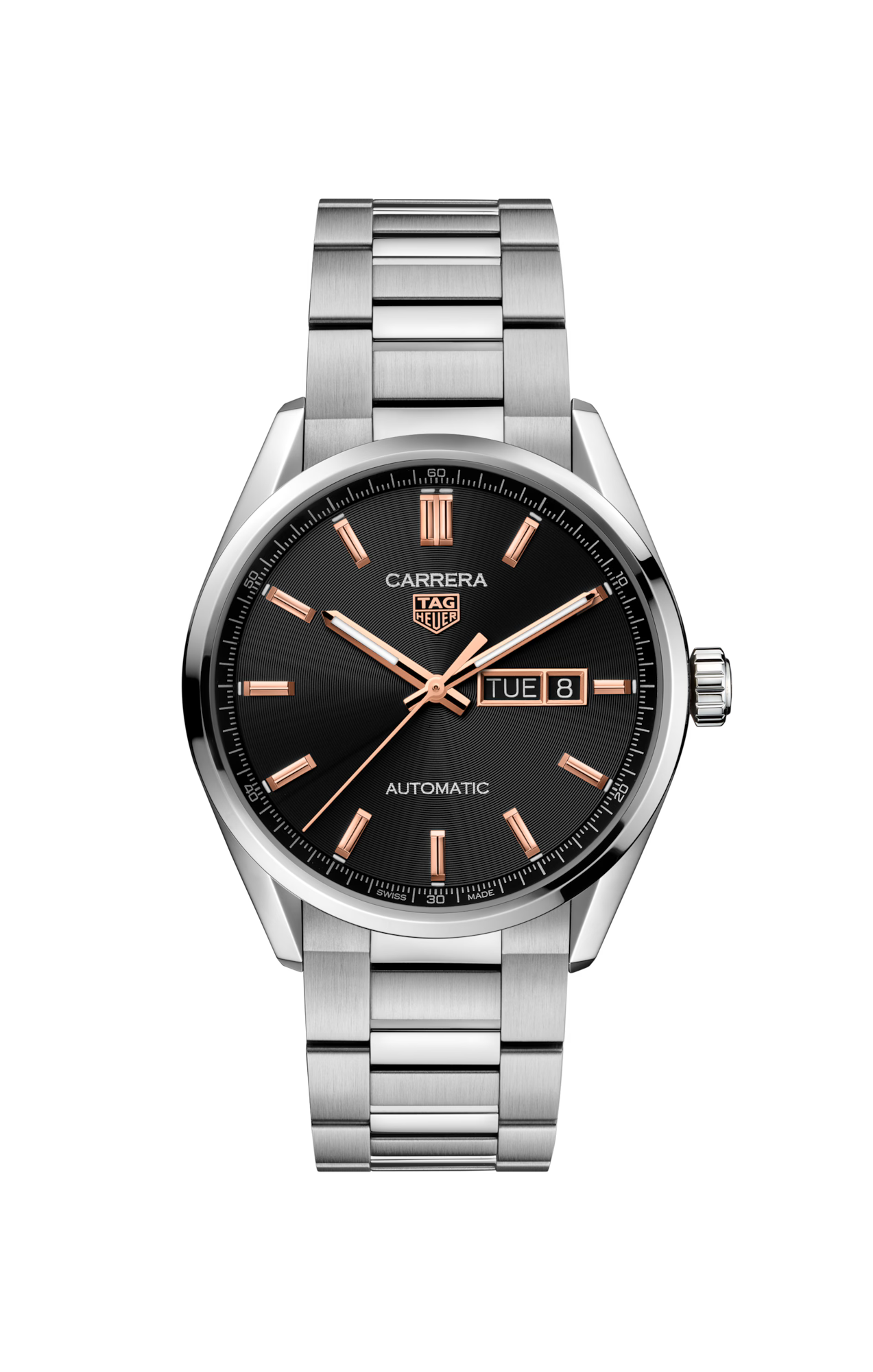 Black and gold combine for a striking luxury look on this resolutely determined TAG Heuer Carrera. With the convenience of a day and date display, there's function to back up the elegant form of this emblematic watch, perfect for those on the go.