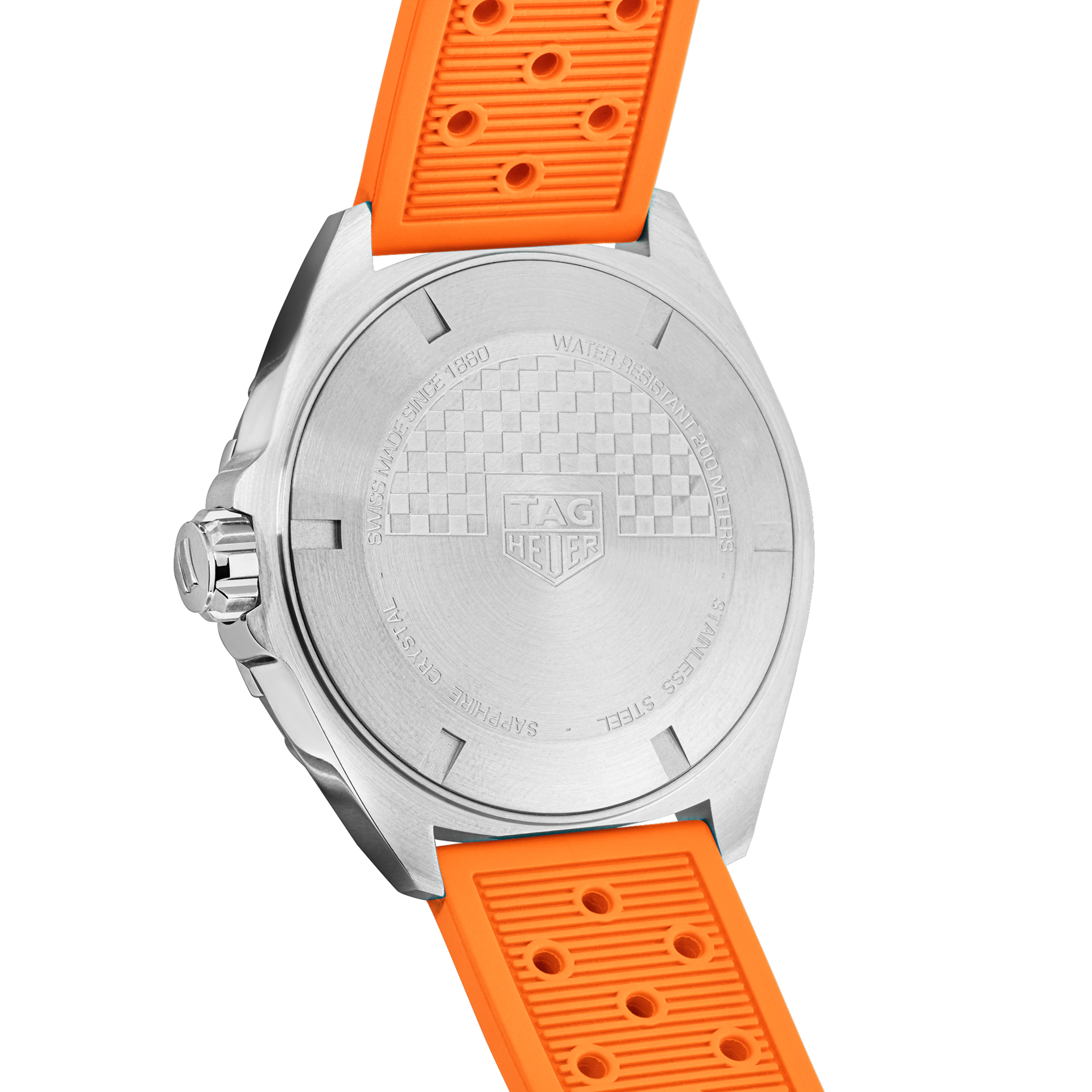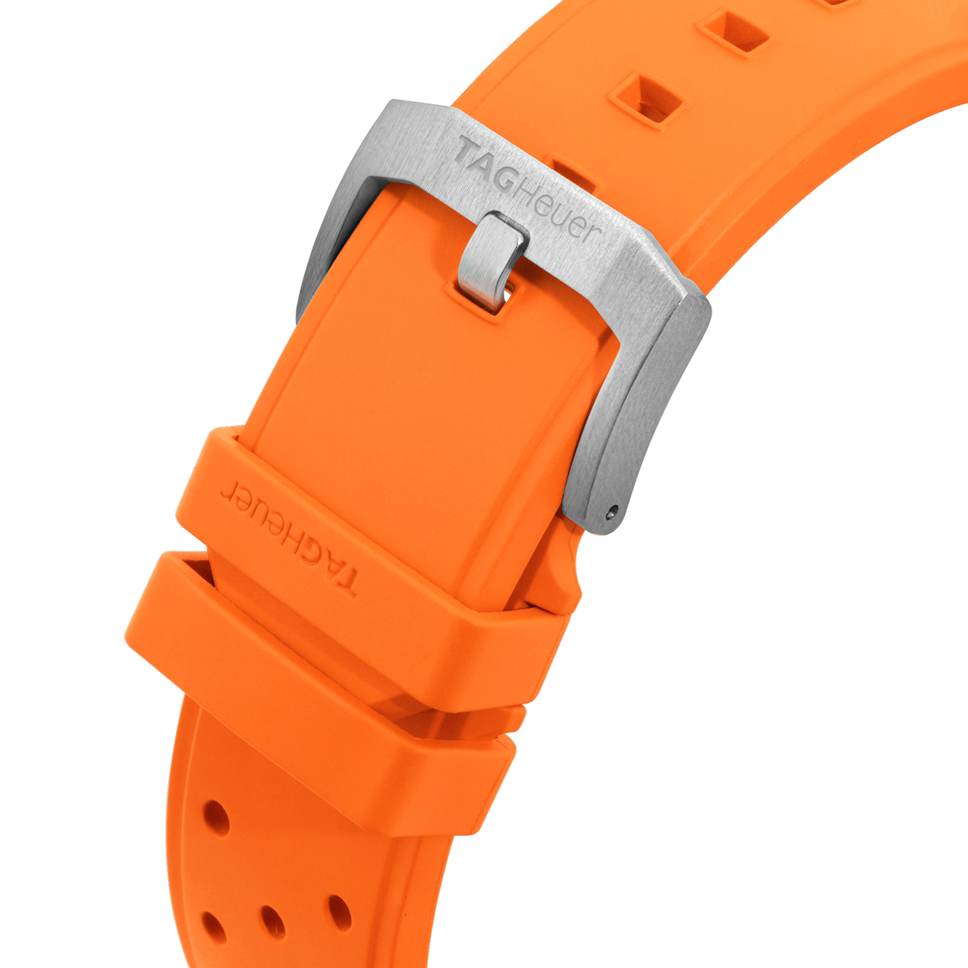 A classic three-hand men’s quartz watch with oversized “6” and “12” on a sunray blue dial, and paired with a vibrant orange rubber strap. Inspired by Formula One, this timepiece embodies TAG Heuer’s unique racing heritage and commitment to excellence under pressure.
