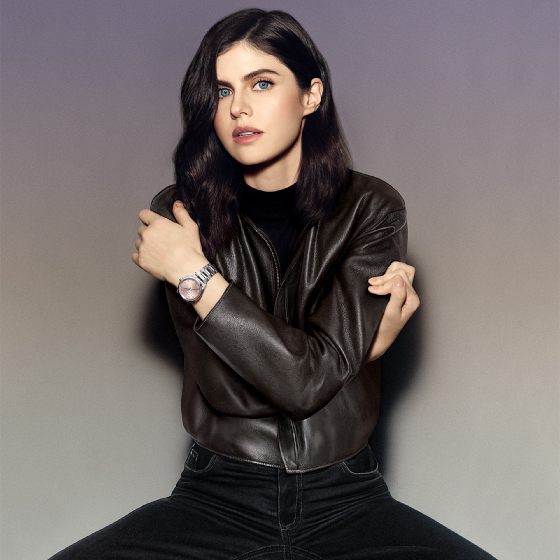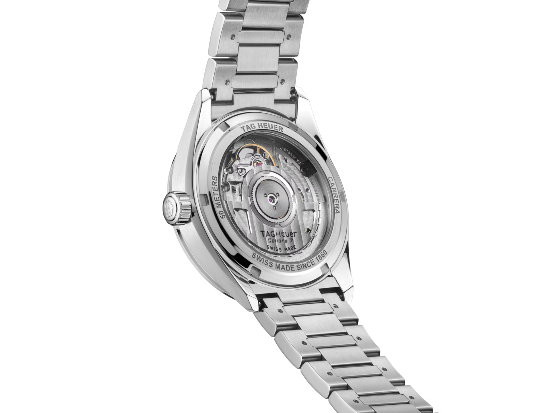 Introducing the TAG Heuer Carrera Date in 36 mm with a soft powdery pink dial. This elegant model features diamond-set indexes and is powered by the Calibre 7 movement, making it both precious and timeless.