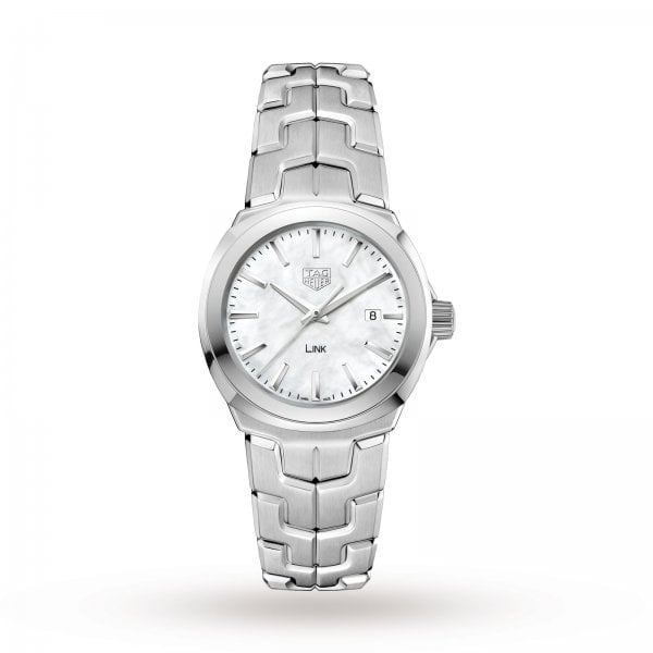 The TAG Heuer Link Lady Quartz watch is an iconic style with its beautifully unique, stainless steel bracelet with a folding clasp which is fine brushed to perfection. The slender, 32mm case is hand polished and boasts a white mother of pearl dial with baton hour markers and a date window positioned at 3 o'clock. You will find the round dial is scratch resistant sapphire crystal glass protecting the dial along with the Swiss made quartz movement, Water resistant to 100m.