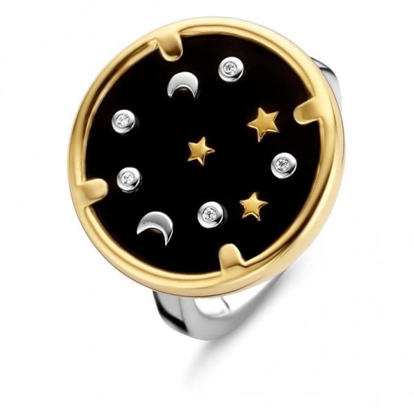 This TI SENTO - Milano gold-plated silver ring 12245BO flaunts a black onyx centre stone decorated with scattered cubic zirconia stones, gold-plated stars and silver crescent moons. This mesmerising universe print is meticulously handset in a gold-plated setting. The ring is crafted from 925 sterling silver. Carry some of this statement piece's cosmic energy with you.
