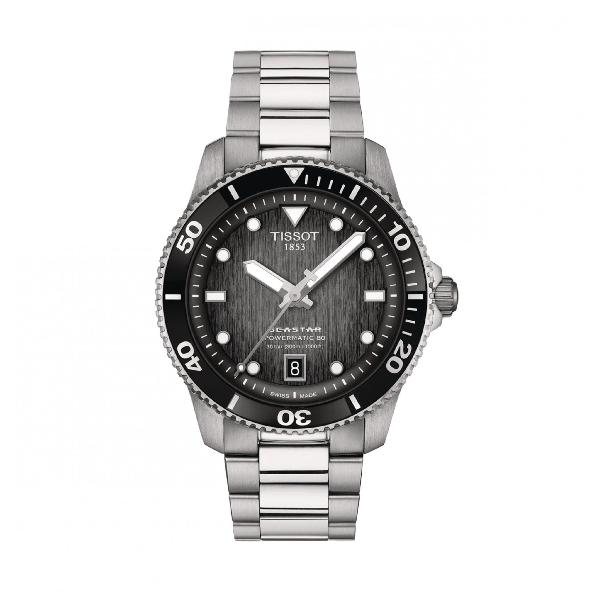 Discover the updated version of one of Tissot's main collections with the new Seastar 40mm Powermatic 80. This new edition has undergone a subtle transformation, incorporating a notch along the edges of the case, resulting in a more compact and sophisticated appearance. This automatic timepiece is the perfect watch for those in search of a sporty yet assertive accessory, offering water resistance up to 1000 feet (300 meters) and improved visibility in dim conditions thanks to the Super-LumiNova® coated hands and hour markers. Discover the unique aesthetic of this stainless steel version with its black gradient dial and matching bezel, following the collection's signature sporty yet bold appeal.