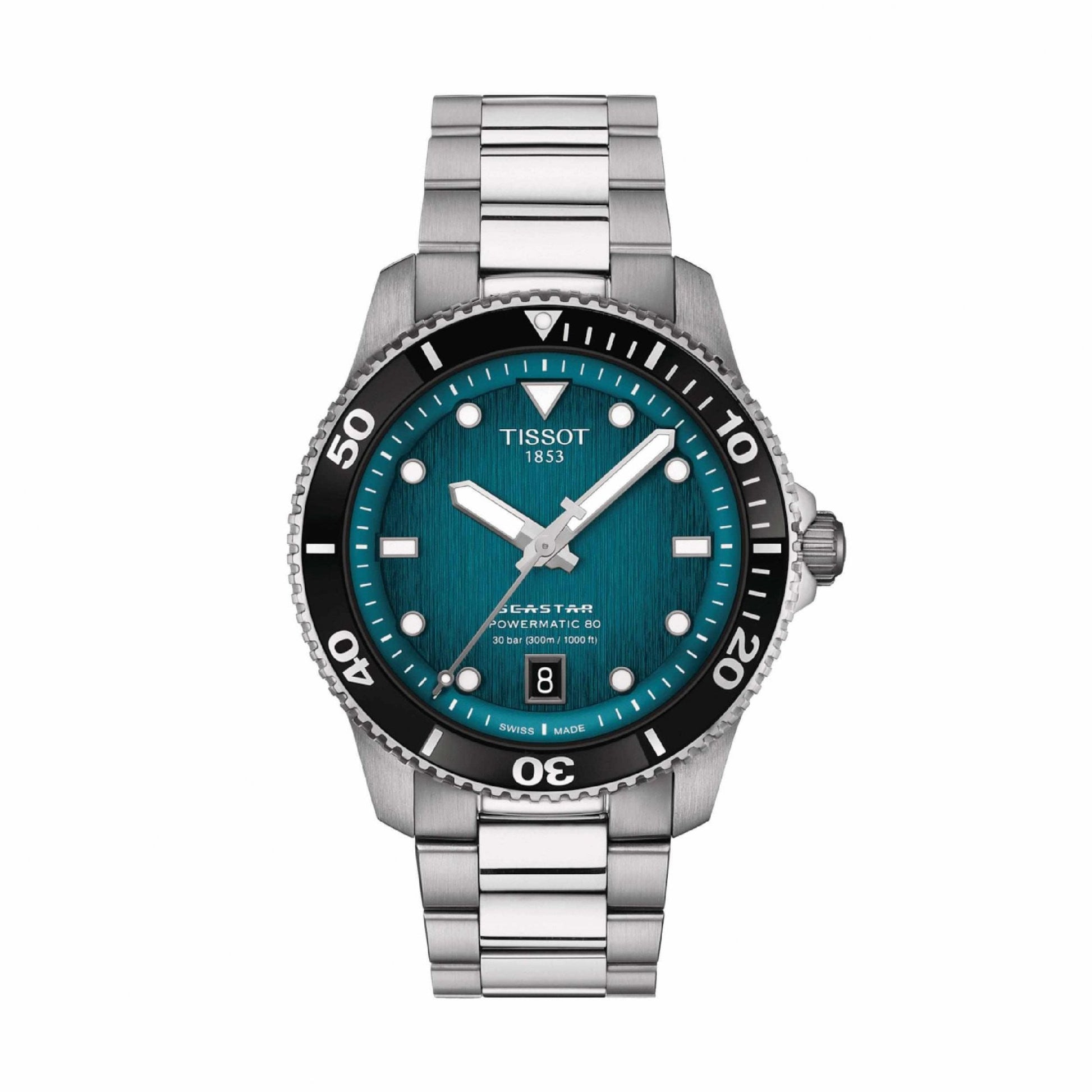Discover the updated version of one of Tissot's main collections with the new Seastar 40mm Powermatic 80. This new edition has undergone a subtle transformation, incorporating a notch along the edges of the case, resulting in a more compact and sophisticated appearance. This automatic timepiece is the perfect watch for those in search of a sporty yet assertive accessory, offering water resistance up to 1000 feet (300 meters) and improved visibility in dim conditions thanks to the Super-LumiNova® coated hands and hour markers. Discover the unique aesthetic of this stainless steel version with its teal blue gradient dial and contrasting black bezel, following the collection's signature sporty yet bold appeal.