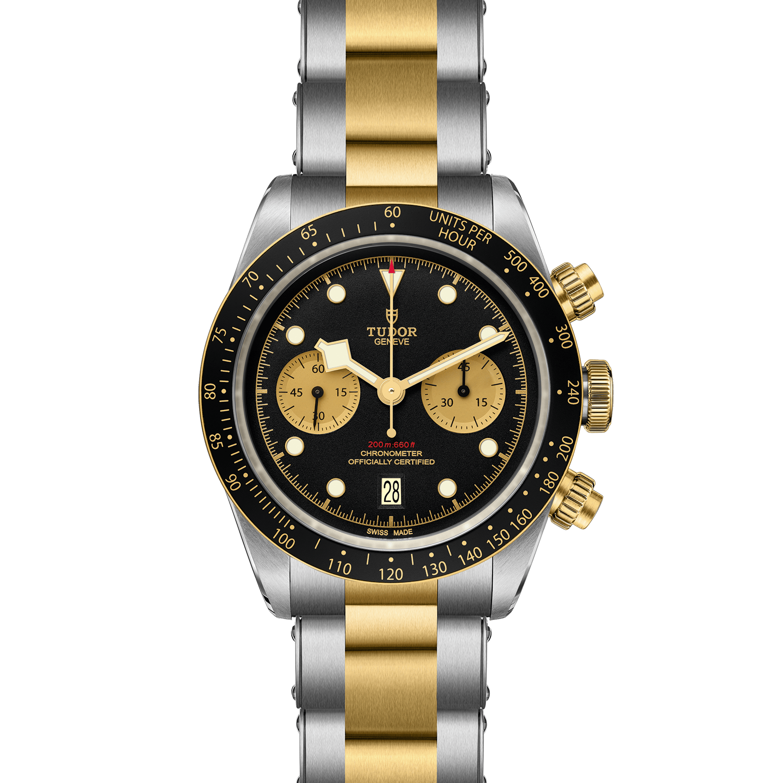 Screw-down winding crown with the TUDOR rose in relief. Solid yellow gold screw-down pushers at 2 and 4 o'clock. Steel covered by a 0.3mm yellow gold cap