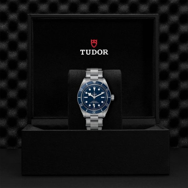 Offering a sporty yet sophisticated look, this Tudor Black Bay Watch showcases a bold blue dial and unidirectional rotatable bezel in steel with 60-minute graduated disc in matt blue anodised aluminium and silver gilded markings and numerals.