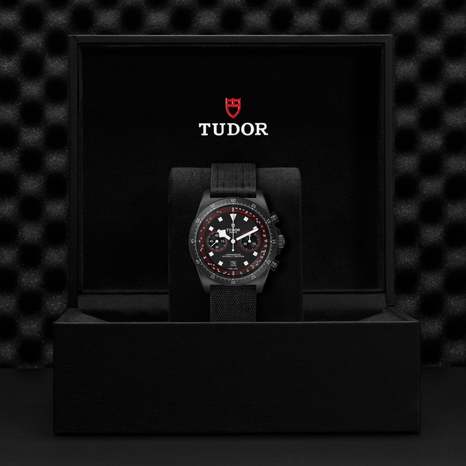 Black, matt, red accents on the chronograph counters and tachymeter scale