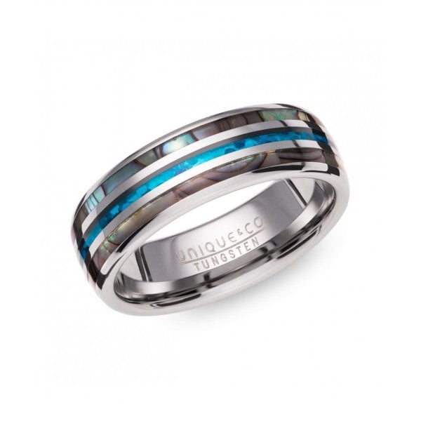 Tungsten 7mm Ring with Abalone Shell & Blue Opal Replica Inlay